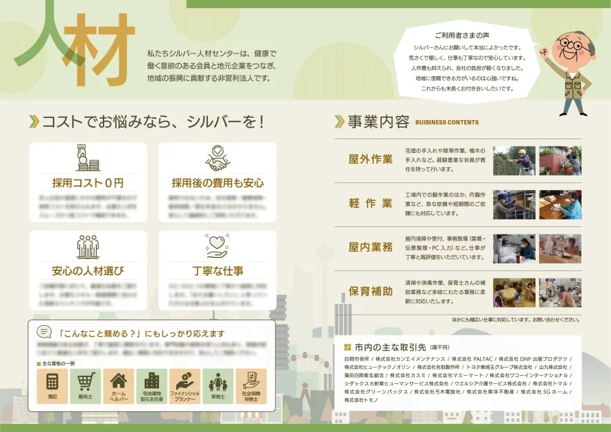 地域の企業や事業者の方に向けて、シルバー人材センターの会員の魅力をわかりやすく伝え、就業依頼へとつなげることを目的としています。