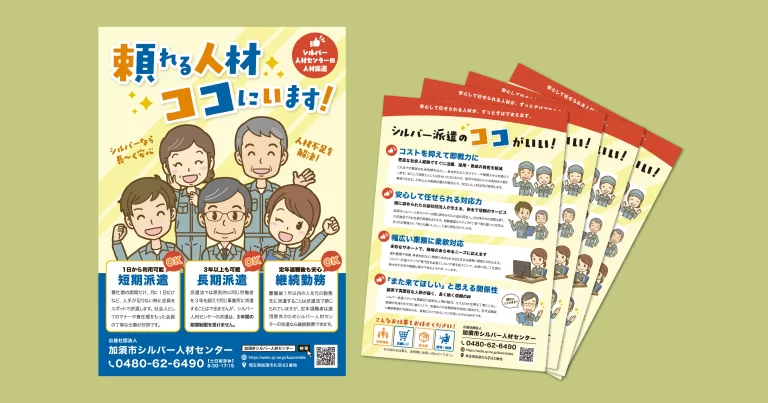 制作の目的企業や事業所の方に向けて、シルバー派遣の仕組みと魅力をわかりやすく紹介し、就業依頼の促進を目的に制作しました。「コストを抑えながら、まじめで丁寧な人材を活用できる」というメリットを、コンパクトにまとめて伝えてい … 続きを読む シルバー人材センター 派遣就業開拓チラシ