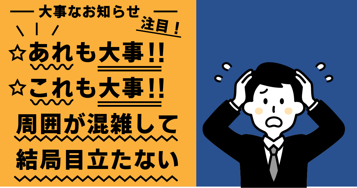 「ここをもっと目立つようにしよう」「ここも目立たせよう」「あ、ここも大事だから…」とやっているうちに、結局ゴチャゴチャしただけで大事なことが目立たない。そんな事態になってしまうのは、「目立つ」を絶対的なものとして考えていることが原因だったりします。