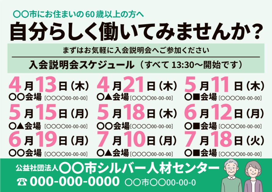 | 4月13日(木)13:30〜 | 〇〇会場 〇〇市〇〇00-00-0 |