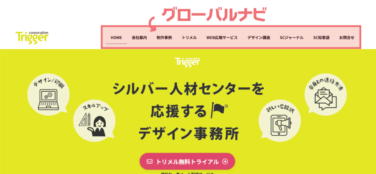基本的には、どのページに移動しても常にサイトの最上部に表示されている。