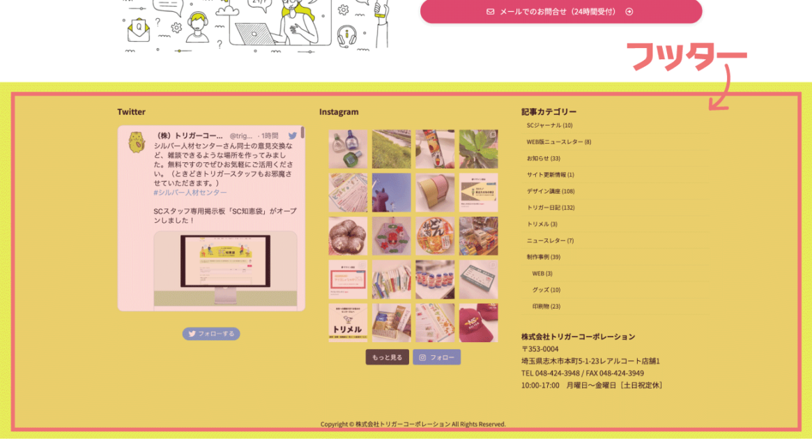 ページの下部にあり、コピーライト、SNS、マップ、リンクなど、全ページで表示させたい補助的なコンテンツを設置することが多い。