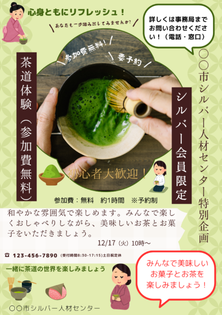例えばこのチラシの場合、イベントの内容と日時予約方法(予約制であること)と連絡先参加費の有無は「必ず記載する情報」です。それ以外の情報は控えめな表現に変えていき、同じ意味の言葉を繰り返すのを避け、読み手に伝わりやすいようなるべく簡潔な表現にしていきます。