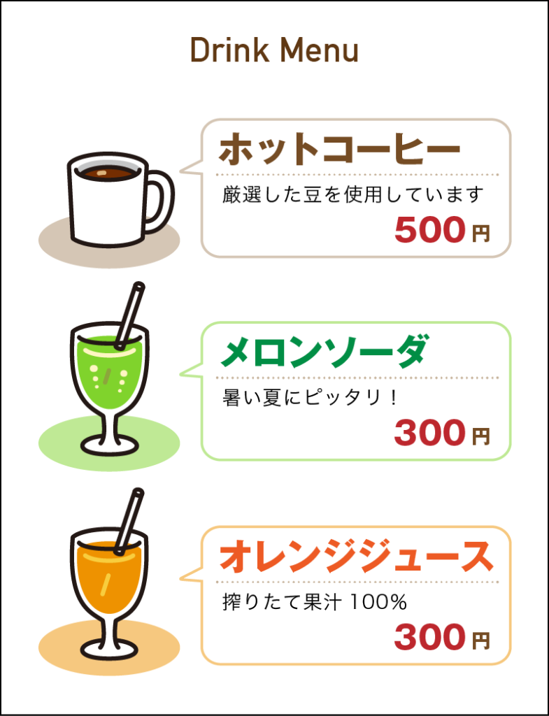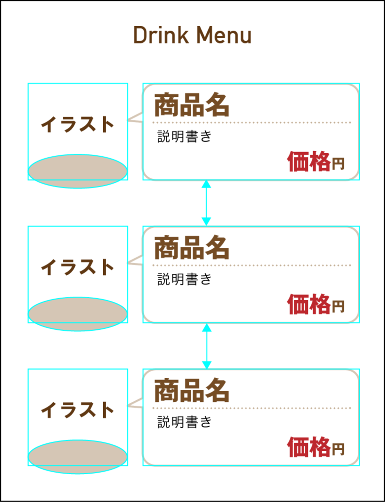 ▲アイテムごとのフォーマット(イラストや商品名・説明書き・価格の位置や書体)を決めます。