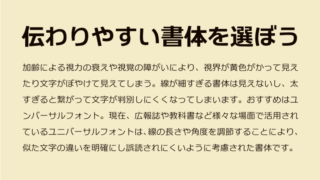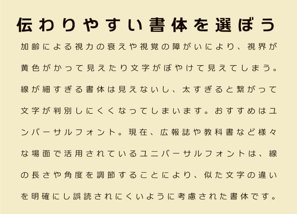 • 長文の場合、ユニバーサルフォントよりゴシック体を使用した方がすっきり見える場合もあります。