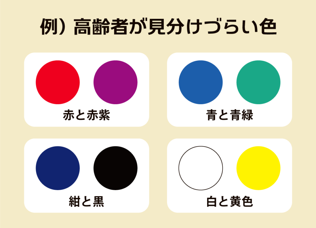また高齢者は明度差の少ない色は見分けづらいと言われていますので、このデザインは色覚障がいを持った方だけではなく、白内障やロービジョンの方にも配慮できていません。では配色を考える時、どのような点に注意をしたら良いのでしょうか。