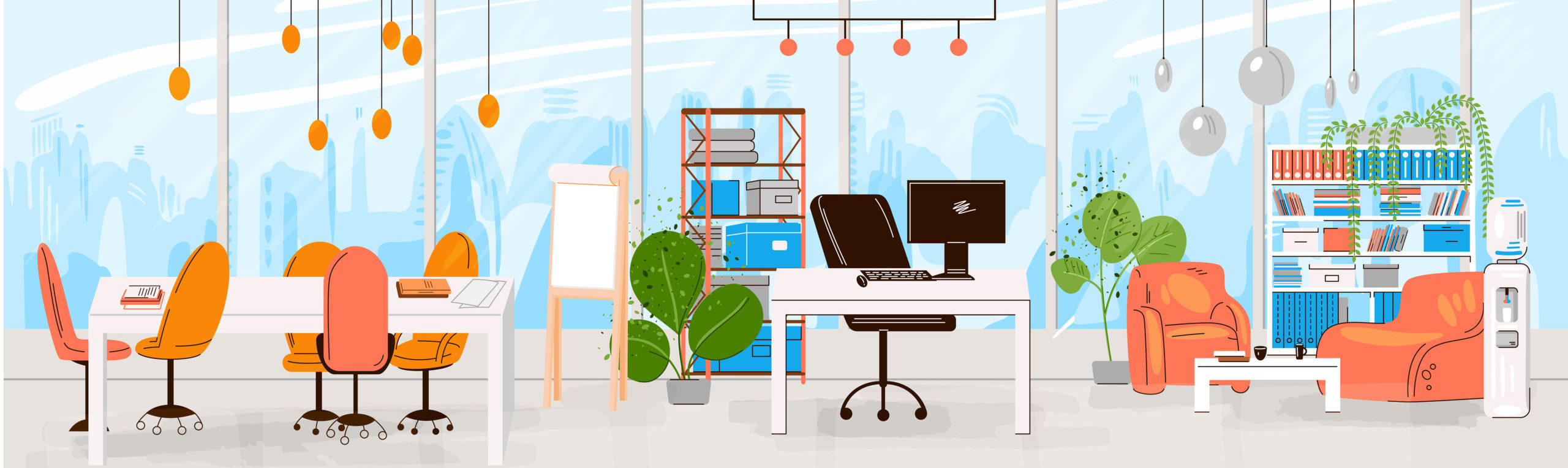 Vector Flat Collection of Creative Workplace with Modern Open Space and Empty Office Interior – Business and Contemporary Co-Working Illustraton. flat horizontal composition.